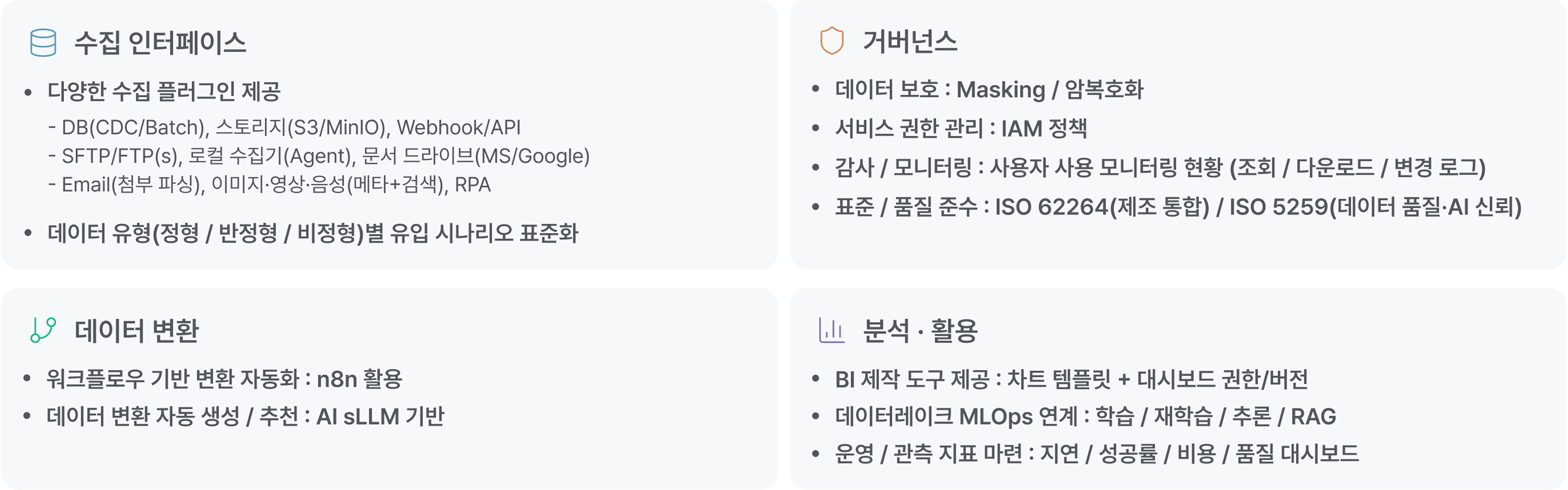 Solution더 보기- 각종 산업 데이터를 ‘AI- Ready Data’ 상태로 자동 변환·유지하는 산업 특화 데이터레이크